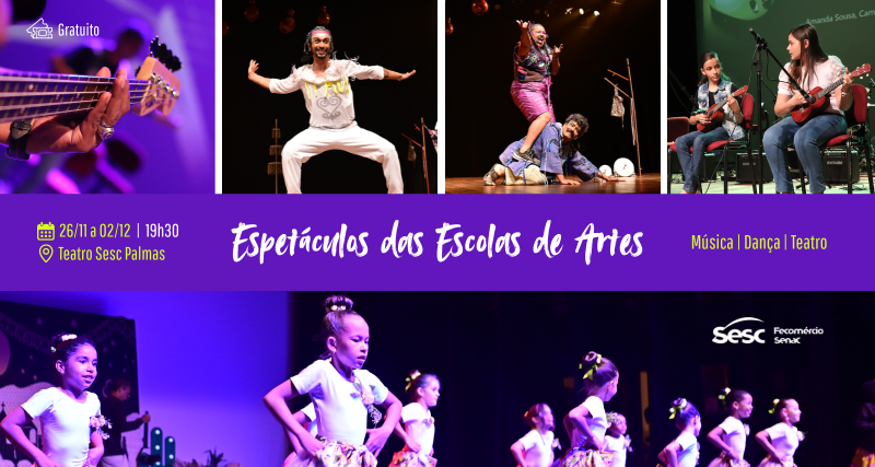 A programação conta com os espetáculos O Jardim dos Sonhos, das turmas de balé e jazz, ¼ de Cena, da turma de teatro, e o Recital da Escola Sesc de Música, das turmas dos cursos de música. Todas as apresentações são gratuitas, de classificação livre e acontecem no Teatro Sesc Palmas, do Centro de Atividades Sesc Palmas, sempre a partir das 19h30.