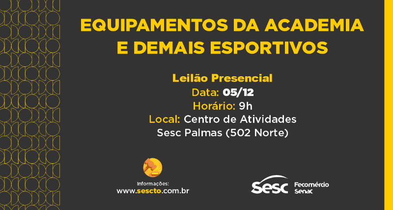 O Sesc Tocantins anuncia o Leilão Presencial de nº 05/25 com 28 itens de academia e demais equipamentos esportivos. No dia 05 de dezembro, sexta-feira, a partir das 9h, o Leiloeiro e a Comissão estarão no Centro de Atividades Norte (Quadra 502 Norte, Avenida LO 16, 21) à disposição dos interessados para o recebimento de documentos de habilitação e de propostas de oferta. A rodada de lances terá início às 9h30, no mesmo dia e local informados.