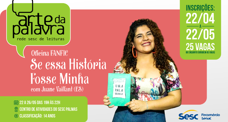 Já criou aquela história de ficção mentalmente e ficou com vontade de aprender a escrever uma Fanfic? O Sesc Palmas tem uma novidade para quem se interessa nesse estilo literário: nos dias 22 a 26 de maio será realizada a oficina de Fanfic - "Se essa História Fosse Minha”, com Juane Vaillant (ES).