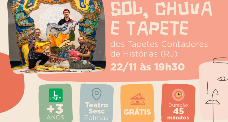 Também faz parte da programação, a apresentação do grupo Os Tapetes Contadores de Histórias (RJ), com o espetáculo “Sol, chuva e tapete”. Por meio de seus tradicionais tapetes artesanais – criados na França, Brasil e Peru – o grupo convida pequenos e grandes a uma viagem pelo mundo através das histórias costuradas. Eles declamam “O Elefante” de Carlos Drummond de Andrade, e narram os causos “A Nuvem Triste” e “Como o compadre coelho conseguiu vencer a baleia e o elefante ao mesmo tempo”, contos populares do Brasil e África Ocidental.