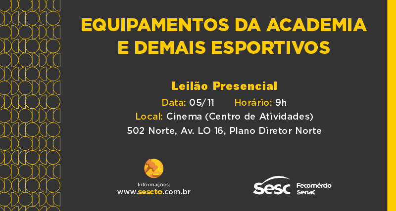O Sesc Tocantins anuncia o Leilão Presencial de nº 04/25 com 65 itens de academia. No dia 05/11, quarta-feira, a partir de 9h, Leiloeiro e Comissão estarão no Centro de Atividades Norte (Quadra 502 Norte, Avenida LO 16, 21) à disposição dos interessados para o recebimento de documentos de habilitação e de propostas de oferta. A rodada de lances terá início às 9h30, no mesmo dia e local informados.