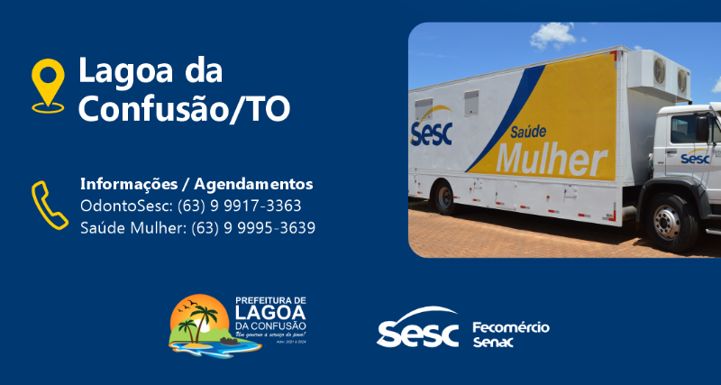 A partir do dia 03 de outubro, a cidade de Lagoa da Confusão, irá contar com os atendimentos gratuitos das Unidades Móveis Sesc Saúde Mulher e OdontoSesc. As Unidades estarão no município até o final do mês de novembro e irão oferecer exames de prevenção e mamografia para mulheres, além atendimentos odontológicos a toda a população O agendamento é feito na própria unidade móvel.