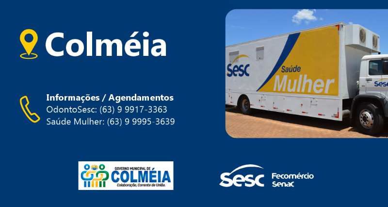 Evento: Unidades Móveis Sesc Saúde e OdontoSesc em Colméia (TO) Local: Feira Coberta, Av. Longuinho Vieira Júnior – Centro Data: 28 de fevereiro Horário: 17h Entrada: Gratuita