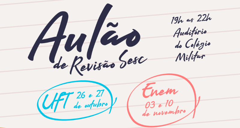 A 1ª etapa do Aulão Sesc de Revisão – UFT, acontece nos dias 26 e 27 de outubro, das 19h às 22h, no Auditório do Colégio Militar do Estado do Tocantins – Unidade II (206 Norte).